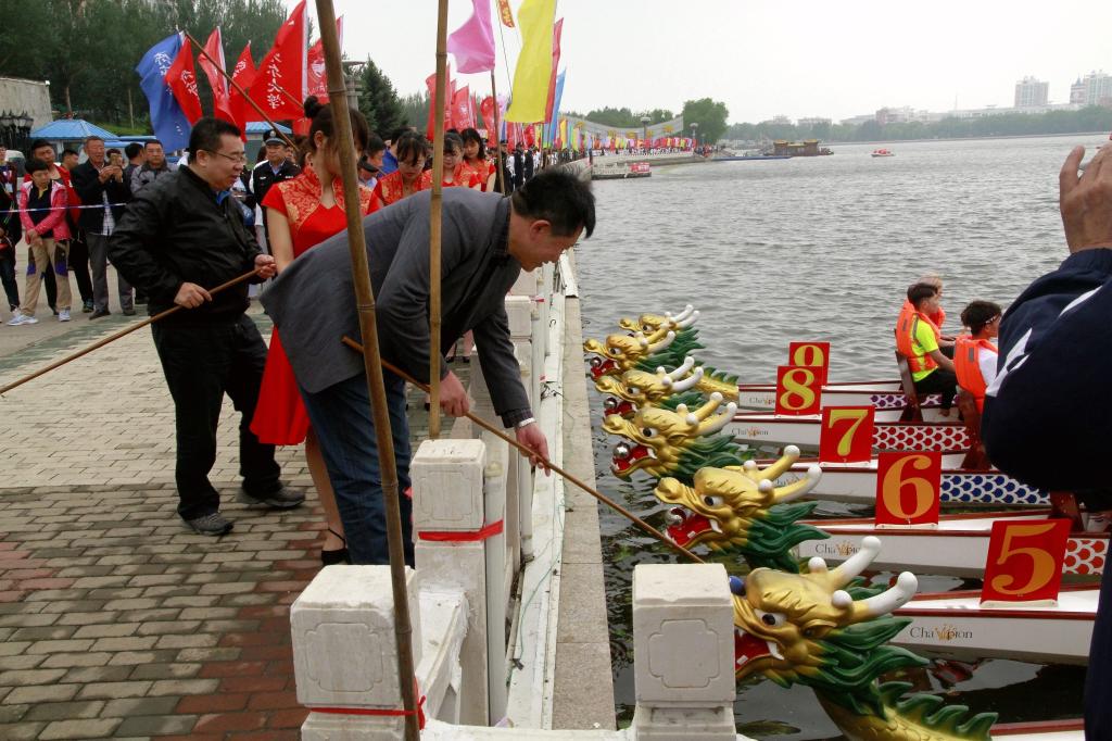 雄黄画额,披红点睛。比赛开始前,按照传统惯例举行了点睛仪式。由出席开幕式的兰景力、毕肃升、王宏镝、陈喜民、刘宪彬、堵留柱等领导嘉宾现场为参赛龙舟进行了点睛。