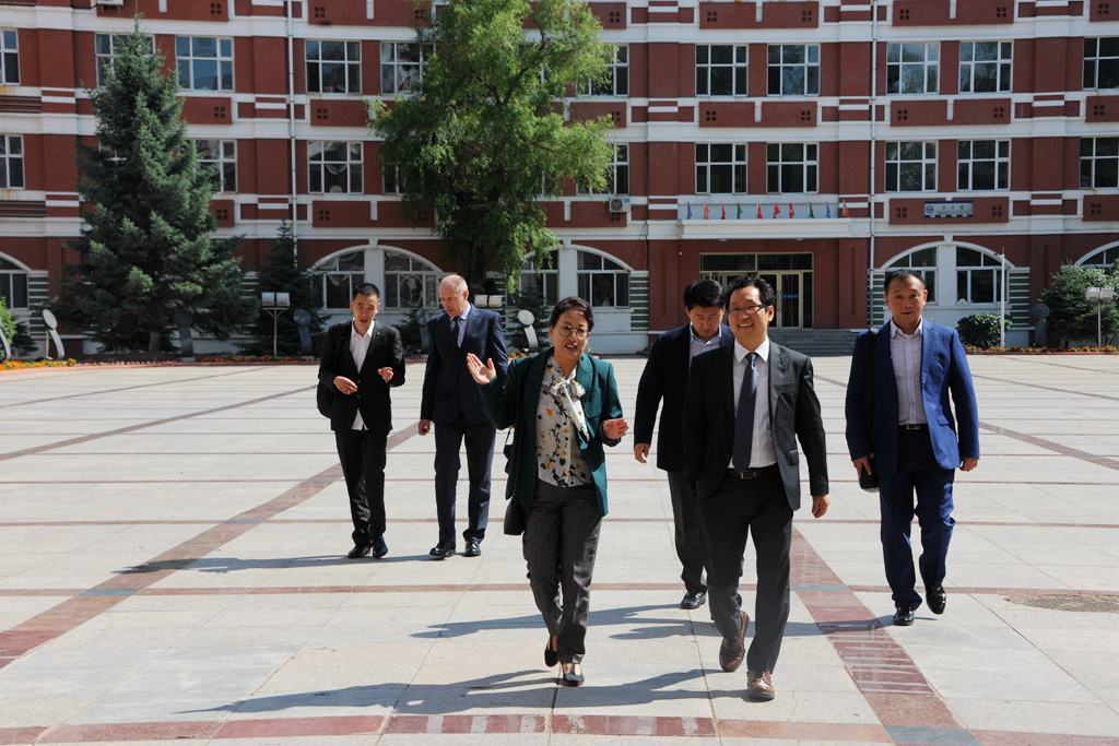 会谈后俄罗斯联邦驻华大使馆基先科先生和甘茹罗夫先生一行在国际交流合作处(国际教育学院)处长(院长)张坤的陪同下参观了校史馆和校园。