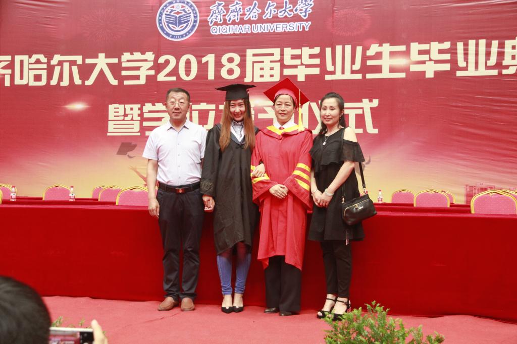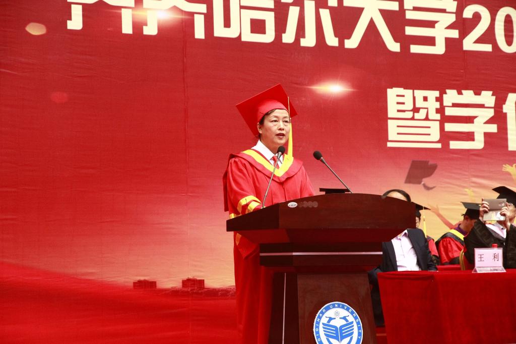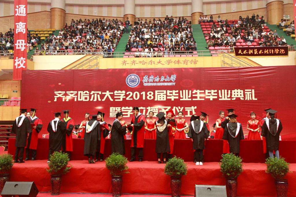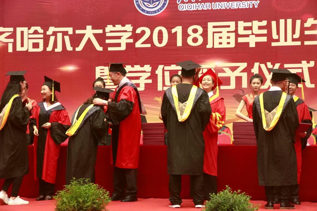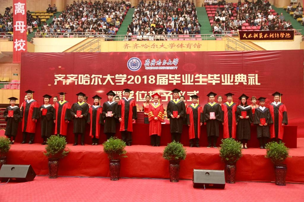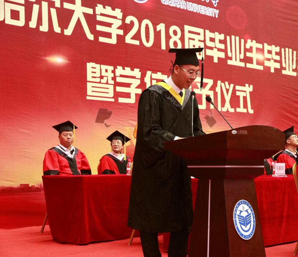 校长陈桂芝在毕业典礼上发表了热情洋溢的讲话,她代表学校对顺利完成学业的毕业生们表示热烈祝贺,向辛勤培育学子的父母、悉心教导学生成长成才的老师表示崇高的敬意和衷心的感谢。她说,你们在校期间,是学校各项事业快速发展的一个时期。2015年,学校登上了全国文明单位的最高荣誉榜,以昂扬向上的精神风貌展示了齐大人的执着与梦想;2016年,学校迎来了“十三五”开门红,国家和省部级科研项目取得了新突破,各项事业都取得了瞩目成绩;2017年,学校圆满完成了教育部本科教学工作审核评估,成功获批“黑龙江省博士学位授权单位立项建设单位”;2018年,学校更是全面启动了“省委巡视整改、审核评估整改、加强作风整顿、新增博士学位授权立项建设单位”等各项综合改革任务,开启了写好奋进之笔的齐大新篇章。你们是这些变化的见证者、亲历者,也是创造者。在我们共同经历学校改革与发展的同时,同学们也完成了人生的蜕变。你们用勤奋的汗水耕耘理想,不负青春韶华,不负家人重望,在大学时代留下了一个个不可磨灭的印记,为学校赢得了荣誉。在此,我要向大家道一声感谢,感谢你们这些年来对学校事业发展的支持和贡献,更特别感谢你们,对学校管理服务中出现的不足、不周、不尽人意之处给予的理解和包容。