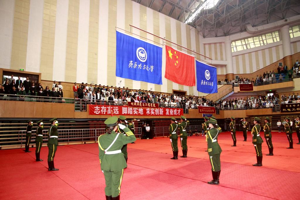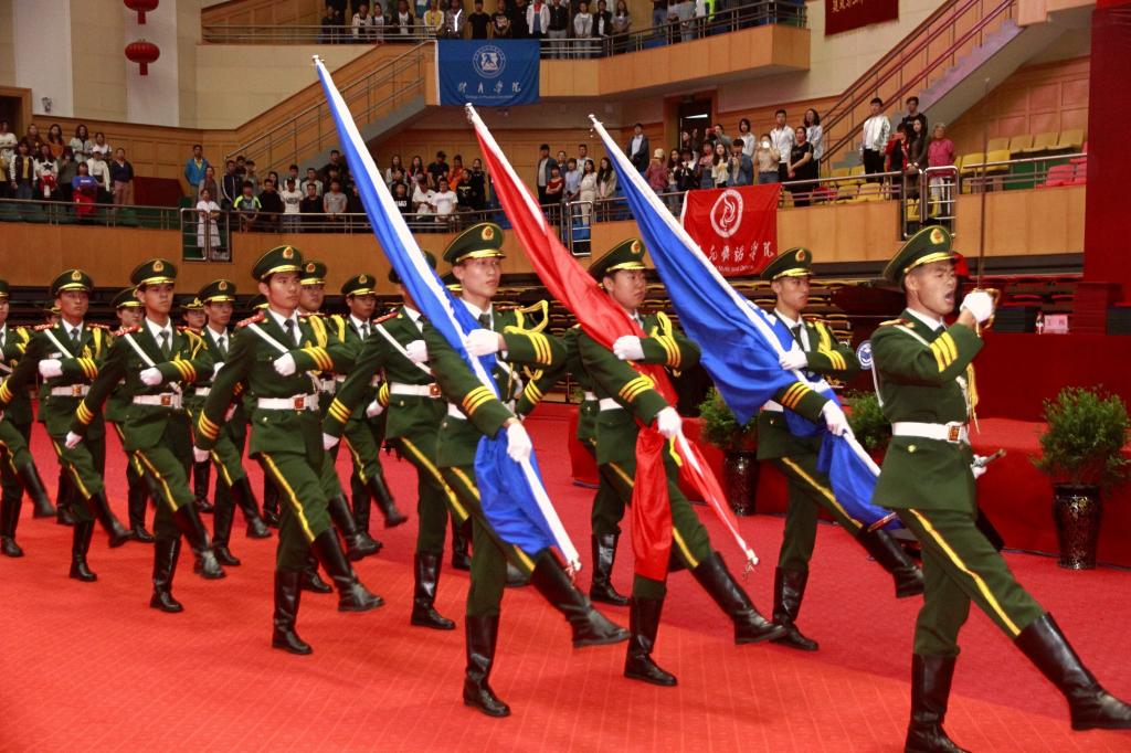 毕业典礼上首先举行了隆重的升旗仪式。学校国旗班同学戎装出旗,步履铿锵。全体起立,面向国旗行注目礼,升国旗、升校旗,唱国歌。