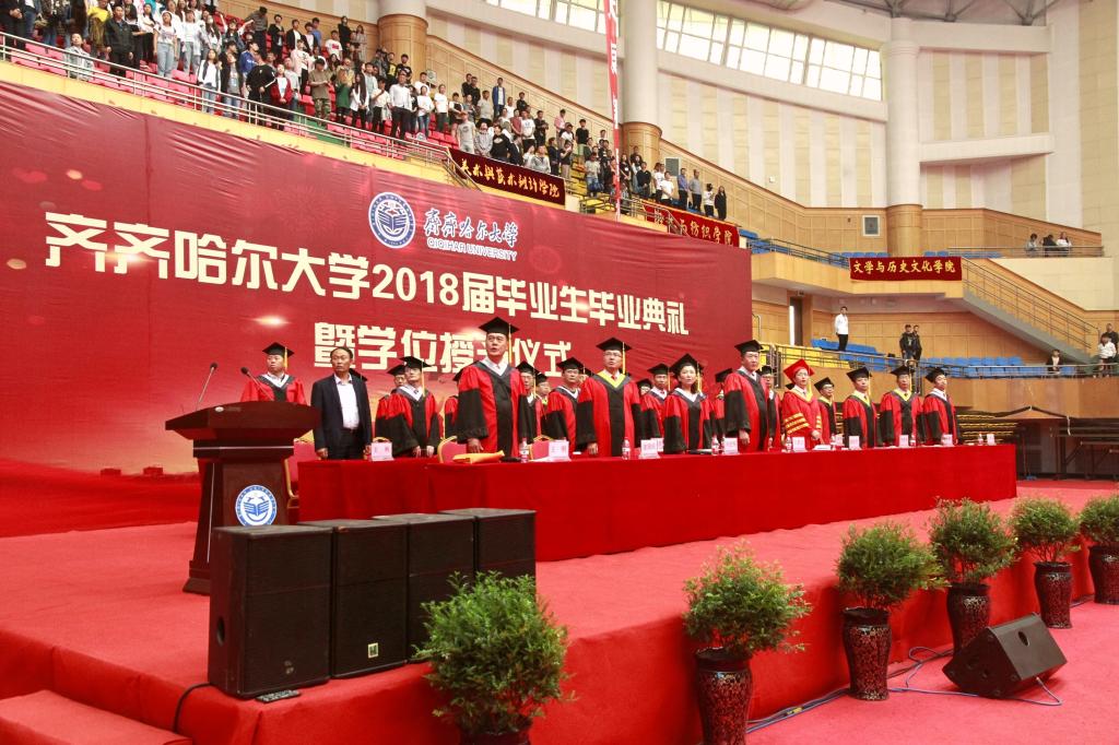 雨润桃李,满园芬芳。在这个充满生机的美好时节,2018届毕业生带着对未来的憧憬和希望,满怀感恩和喜悦,迎来了他们人生中神圣而光荣的时刻。6月27日上午,齐齐哈尔大学2018届学生毕业典礼暨学位授予仪式在学校体育馆隆重举行,校领导兰景力、陈桂芝、齐宏伟、王刚、李英杰、姜国庆、张树军、吕厚均出席了典礼,学校学位评定委员会成员及各学院院长、1999届政治教育专业毕业的优秀校友代表王利、100余名学生家长代表与即将奔赴祖国各地的3000余名毕业生代表共同参加了此次盛典。毕业典礼由副校长王刚主持。