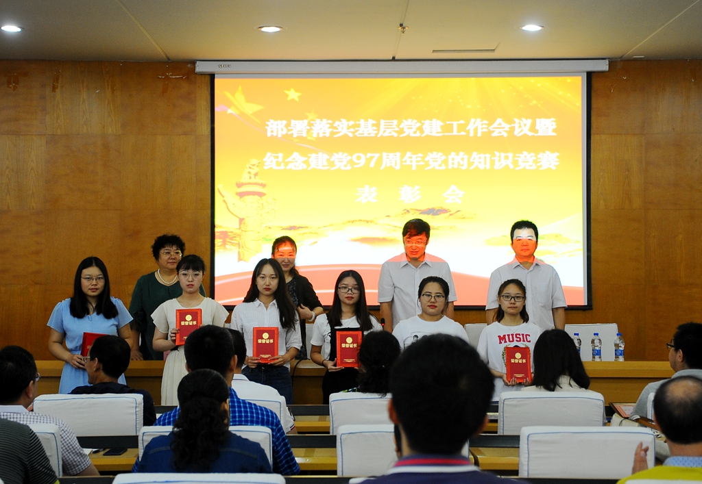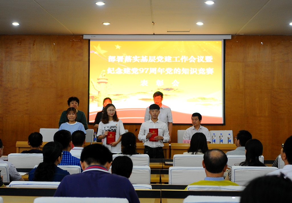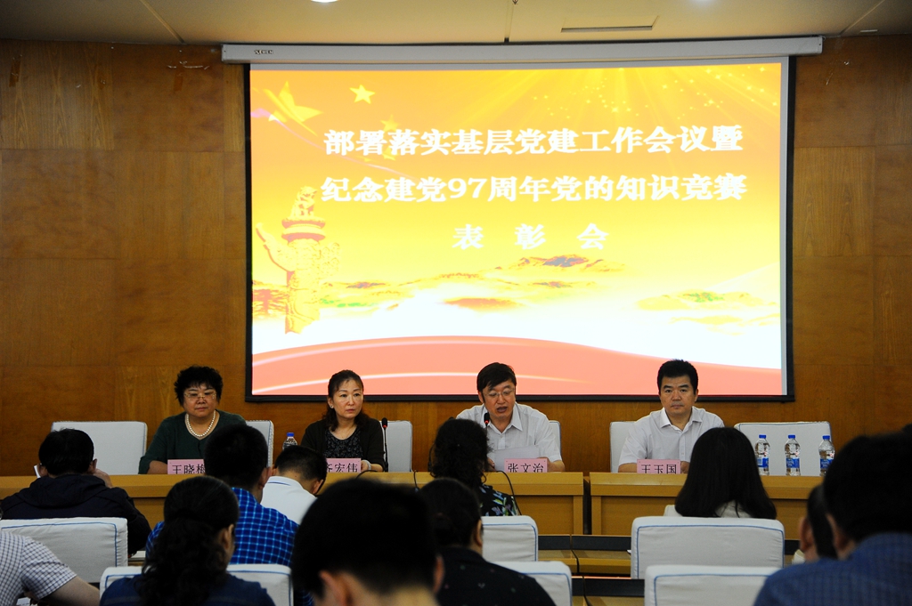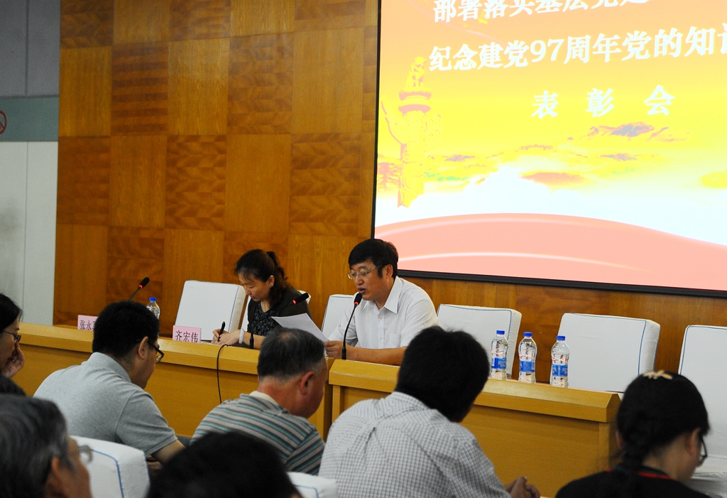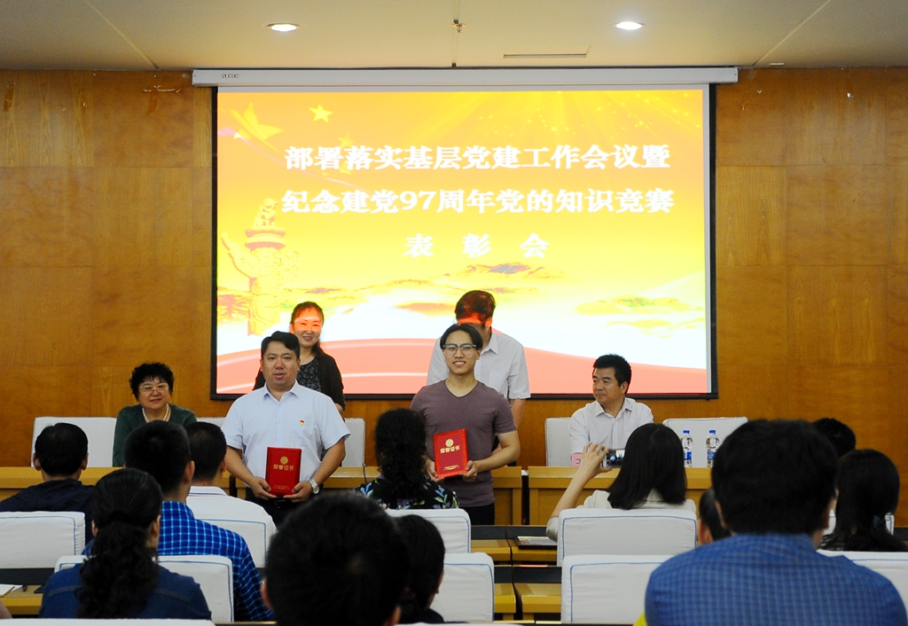 会上,学校党委对在庆祝建党97周年党的知识竞赛活动中取得佳绩的组织和个人进行了表彰,齐宏伟宣读了获得“优秀组织奖”的12个党委、直属党支部名单,张文治宣读了获奖的个人名单。