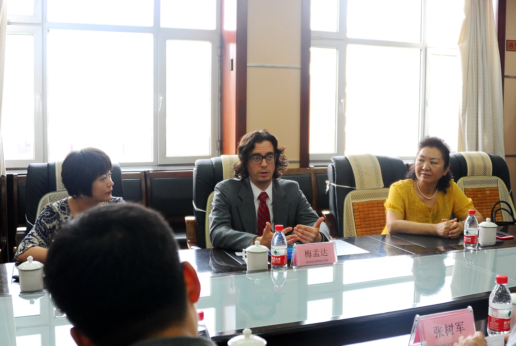 副校长张树军在讲话中代表学校向梅孟达先生一行表示欢迎,并详细介绍了我校的情况以及目前我校与美国高校在科研合作、教师与学生交流方面的具体合作情况。他指出,希望未来继续和美国驻沈阳总领事馆保持密切往来,不断增进双方的交流,加强各领域的合作;也希望美国驻沈阳总领事馆推动更多美国高校与我校开展切实合作,并推荐美国高层次专家来我校进行授课。