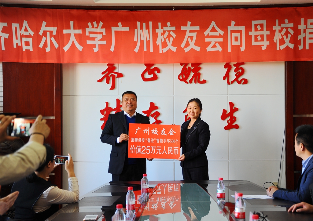 刘德权代表广州校友会向母校赠送“善注”智能爱心手环