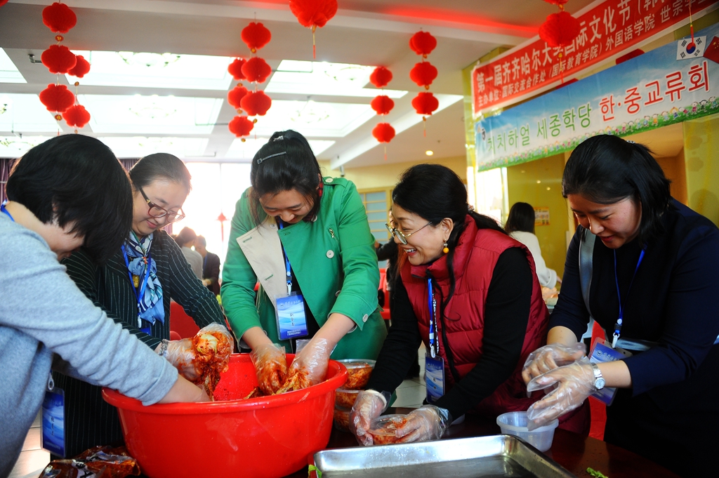 此次活动以韩国传统美食“泡菜”为主题,由韩国教师详细讲解演示泡菜的制作过程。师生们亲自动手制作泡菜,并与打糕等韩国传统美食一起品尝,活动现场气氛热烈。