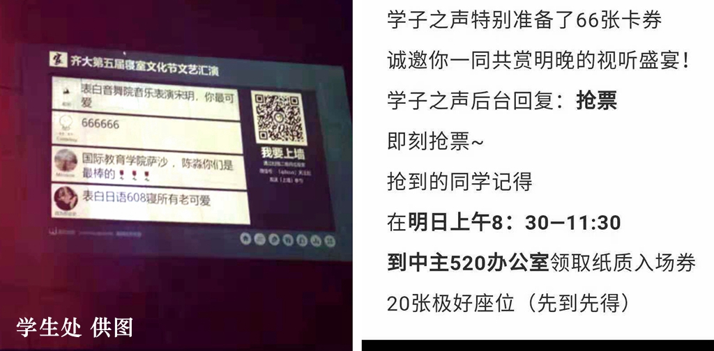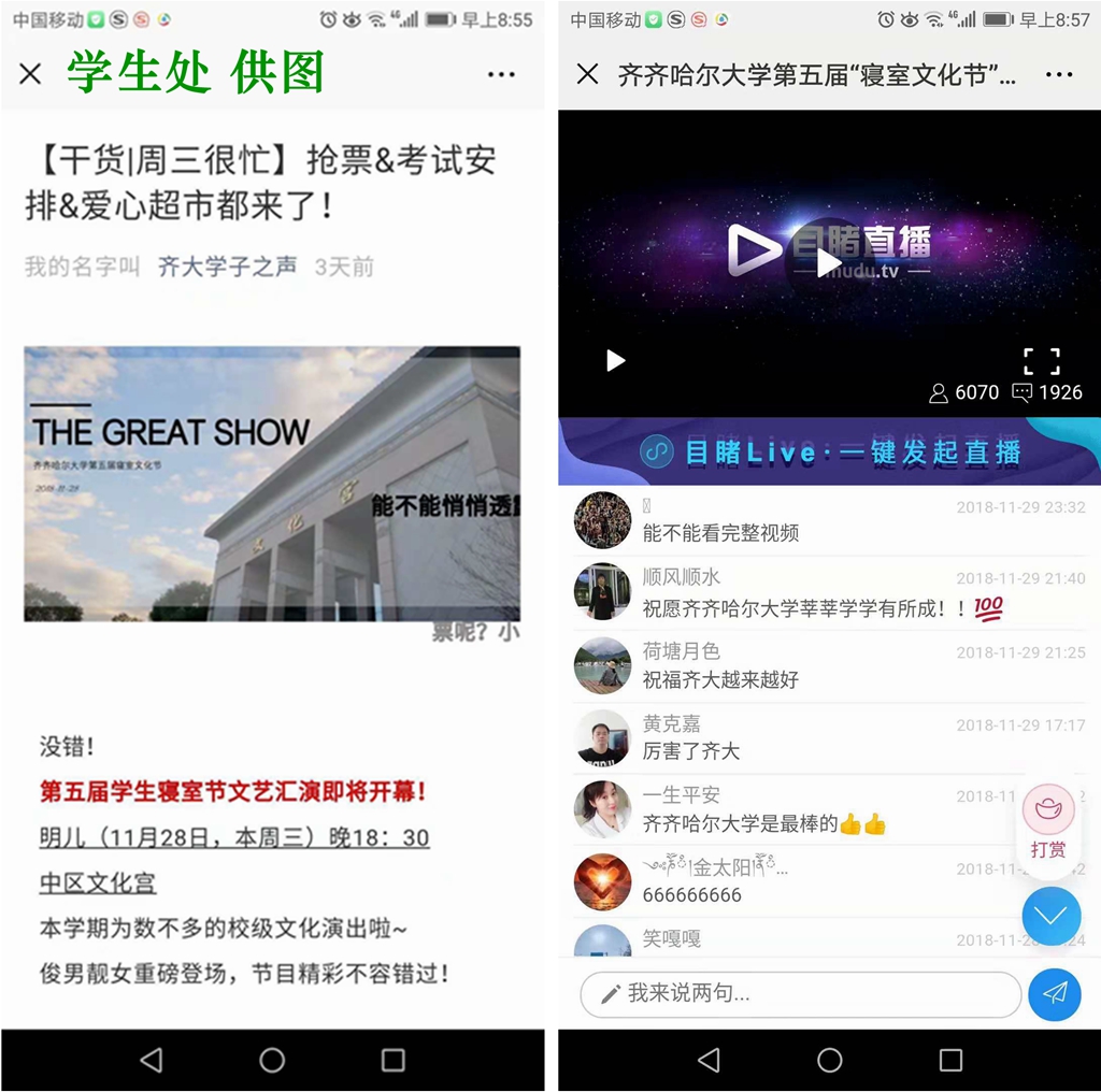 晚会充分融入了“互联网+”的时代特点,将线上互动和线下演出紧密结合起来,通过“齐大学子之声”微信公众平台进行了抢票活动,吸引了同学们的极大关注。并通过“目睹直播”进行了在线直播,众多在校生、毕业生刷屏关注,直播热度居高不下,成为校园热搜话题。同时还通过回复“我要上墙”进行了留言互动。