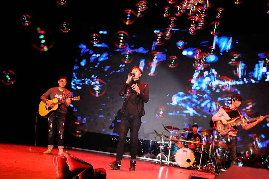 我校老牌学生乐队--火柴乐队登场,感人肺腑的前语,寥寥几语道尽乐队史。BEYOND的《冷雨夜》带动观众们轻声哼唱,回首曾经的岁月;原创歌曲《渴望黎明》点燃全场,每个人摇晃着手中闪光灯的光芒,一同渴望着最美的黎明。