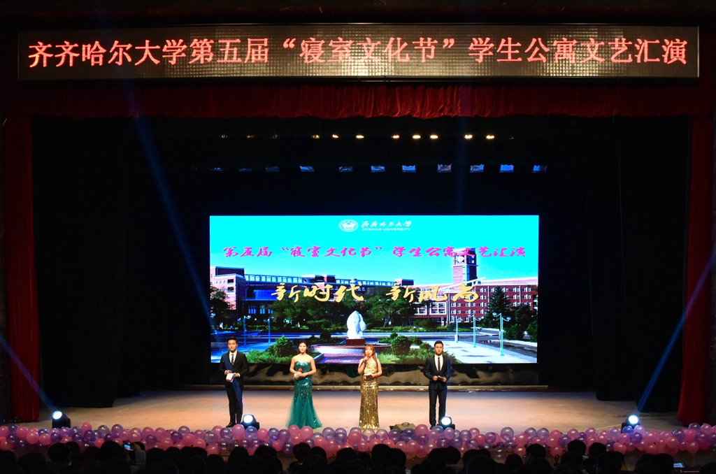 按照《齐哈尔大学第五届“寝室文化节”实施方案》安排,11月28日晚6时30分,齐齐哈尔大学第五届“寝室文化节”闭幕式暨“新时代,新风尚”学生公寓文艺汇演在文化宫隆重举行,本次晚会由学生工作部(学生处)主办,音乐与舞蹈学院承办。副校长李英杰出席活动,学生工作部(学生处)、宣传统战部、组织部、校团委等部门负责人,各学院主管学生工作的副书记副院长以及学工办主任、辅导员、各公寓管理员、公寓辅导员、外国留学生代表、各级学生组织代表、各学院2018级新生代表以及特地返回母校的毕业生1400余人共同观看了晚会,晚会实况通过“目睹直播”在网络上同步直播。