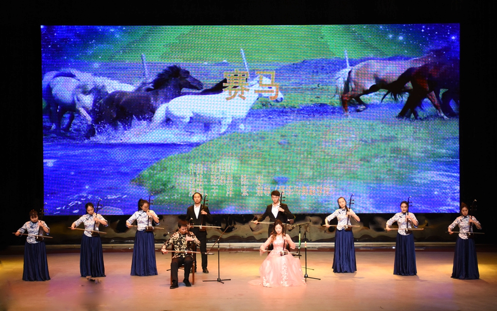 二胡作为中国的传统乐器,以奇特的音乐腔调深受人们喜爱,音乐与舞蹈学院青年教师于洋、张婧与8名同学带来了二胡齐奏《赛马》,二胡快弓、跳弓技巧的运用,拨弦、颤音技巧的运用,为台下观众展现出一幅生动热烈的赛马画面。