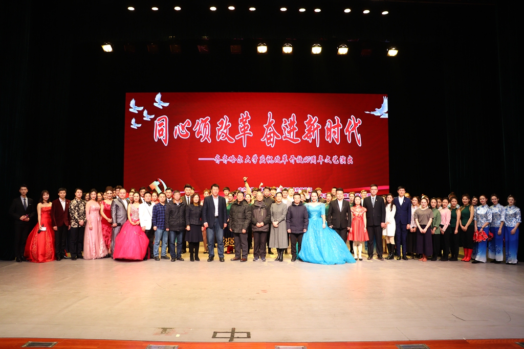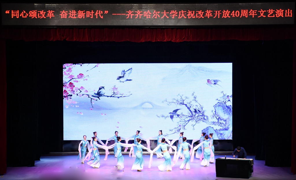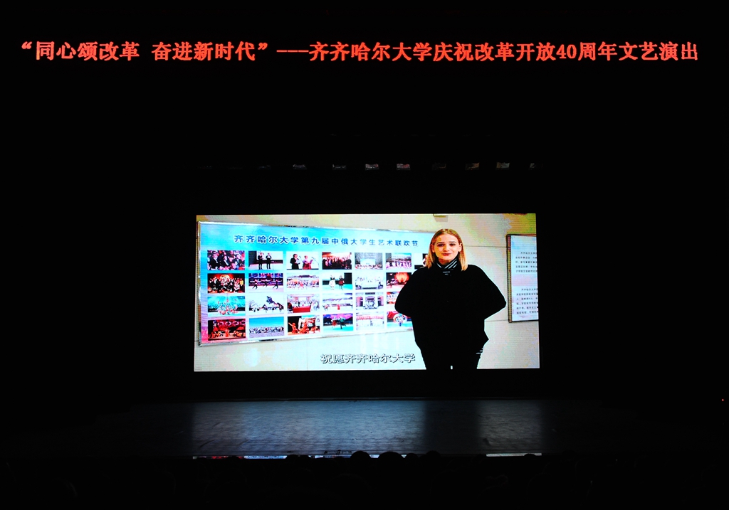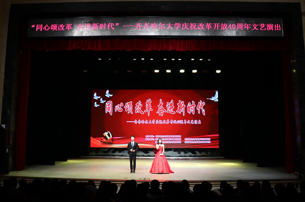 演出正式开始前,播放了由宣传统战部历经两个多月精心策划制作的《“颂改革 忆齐大 携手新征程”——齐齐哈尔大学庆祝改革开放40周年专题片》,由20名不同时期的齐大人讲述齐大故事,展示齐齐哈尔大学在改革开放40年中的沧桑巨变。观看的师生深刻感悟到了齐大人在办学过程中呈现的“养正毓德 精存自生”的校训精神。