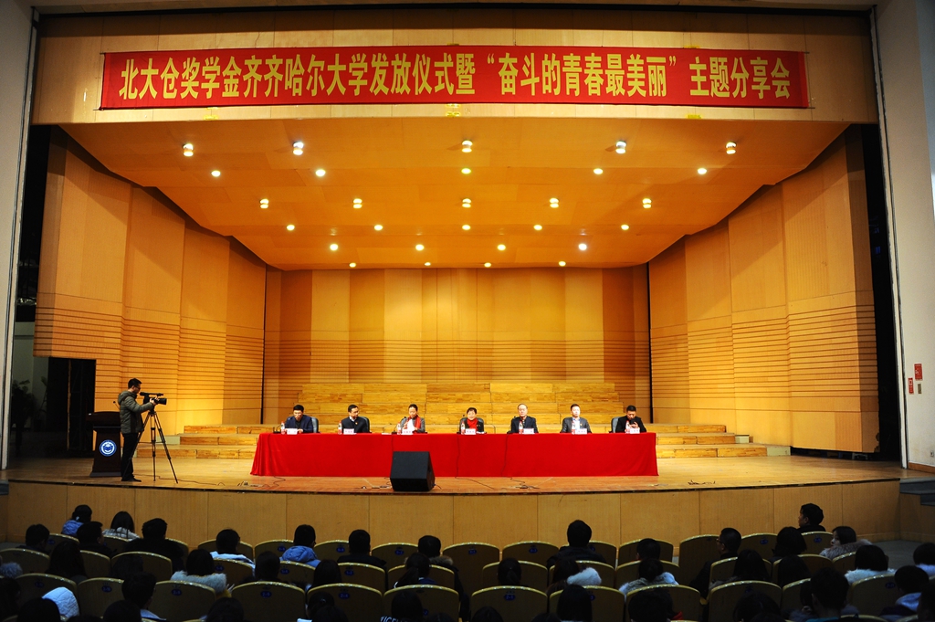 12月19日下午,北大仓奖学金齐齐哈尔大学发放仪式暨“奋斗的青春最美丽”主题分享会在音乐厅召开。黑龙江北大仓集团有限公司总经理隋熙凤、总经理助理高利军,共青团齐齐哈尔市委员会书记郑德利、副书记徐渤程,齐齐哈尔大学校长陈桂芝、副校长王刚出席会议,我校北大仓奖学金获得者及各学院师生代表共750人到场参会。会议由学生工作部(学生处)部(处)长姜波主持。