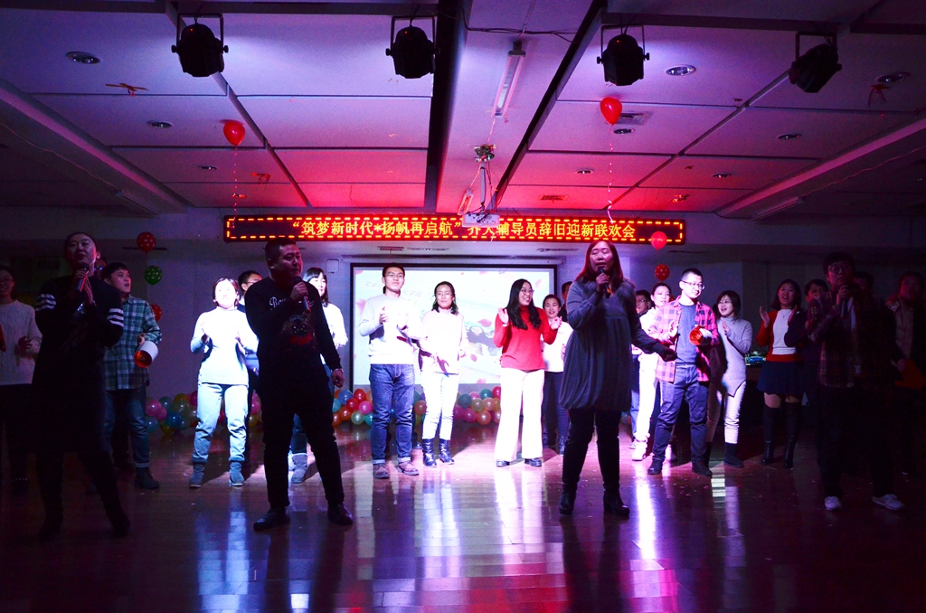 全校学生工作干部联谊联欢,载歌载舞,小合唱《走进新时代》、情歌对唱年代秀、相声《我是个优秀辅导员》、舞蹈《Fire on you》、配乐诗朗诵《改革开放四十年》、小品《梦回校园》、歌曲合唱《相亲相爱一家人》、游戏《幸福踩踩踩》、《爱心传递》,联欢会最后以东区各学院全体辅导员合唱《学工版拥抱明天》圆满结束。