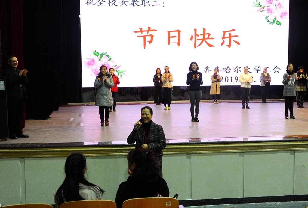 在跳绳比赛游艺活动现场,陈桂芝代表学校向全体女教职工致以节日的问候和衷心的祝福!她对女教职工在推进落实省委巡视整改、审核评估整改、作风整顿、新增博士学位授权立项建设单位和优势特色学科建设等工作中勇于担当的突出表现和不让须眉的巾帼风范给予了高度评价,对女教职工积极参加体育锻炼,在活动中放松心情、感受快乐、释放自我、锤炼品质的做法给予了充分肯定。她指出,齐大能发展到今天,离不开女同胞们做出的杰出贡献,希望女教职工们在推进学校高质量发展工作中切实发挥出“半边天”的积极作用。