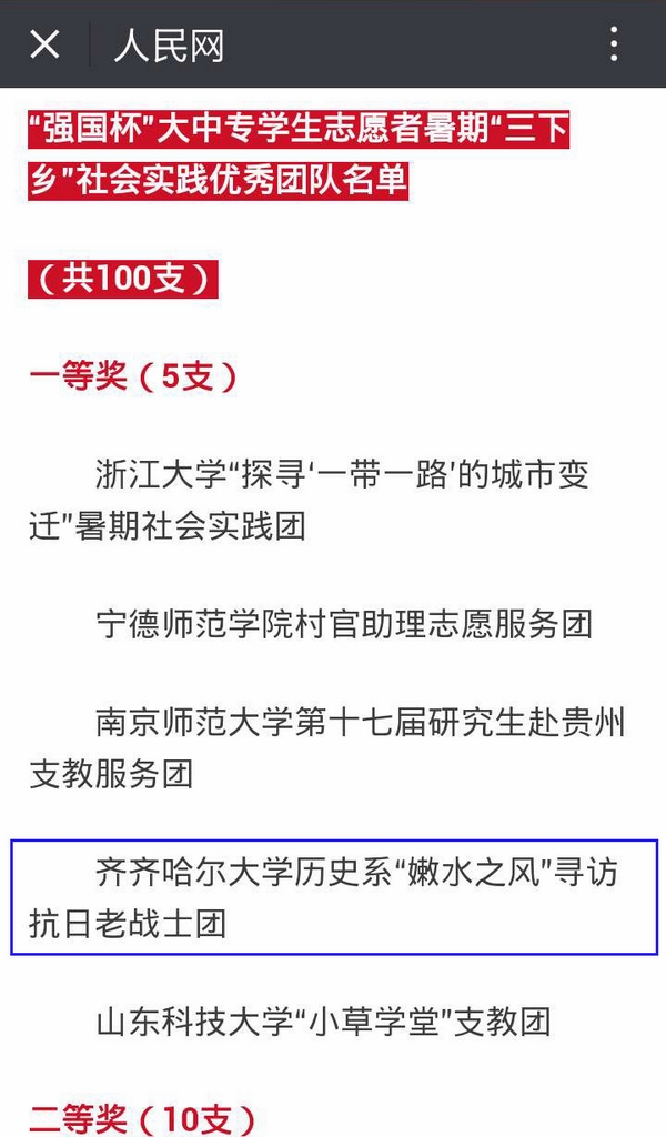 12月30日,人民网微信公众号发布了2015年“强国杯”大中专学生志愿者暑期“三下乡”社会实践优秀团队名单,我校“嫩水之风”团队荣获一等奖。