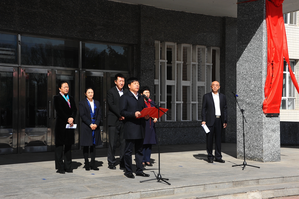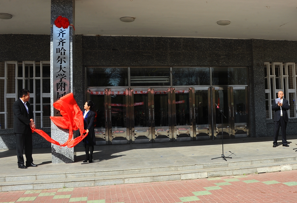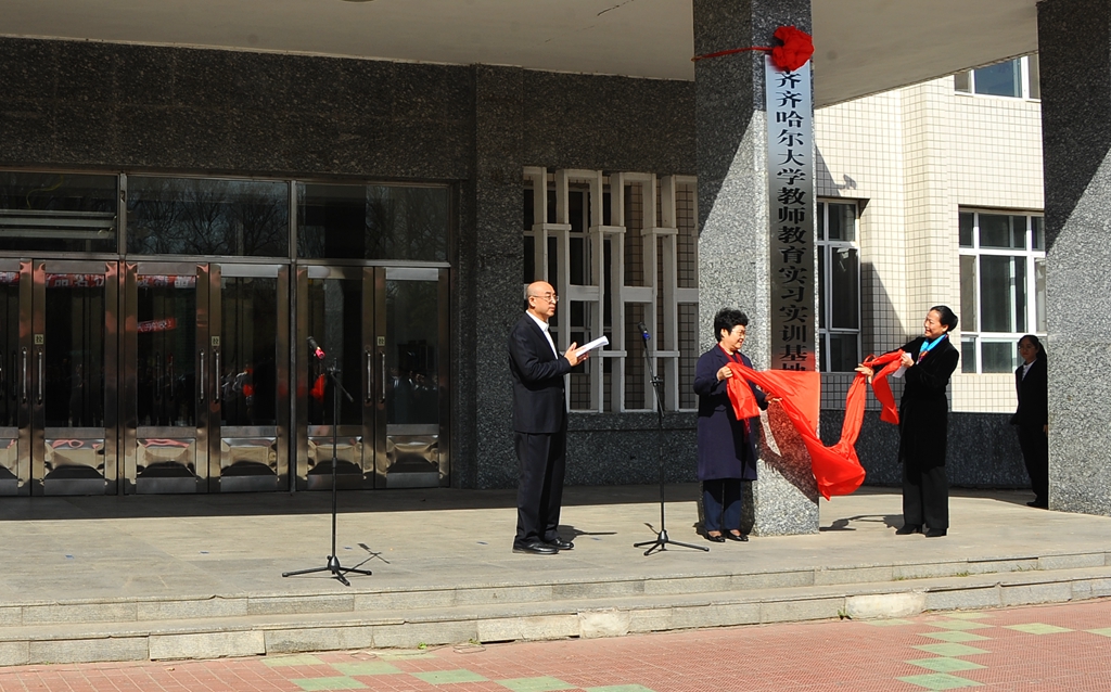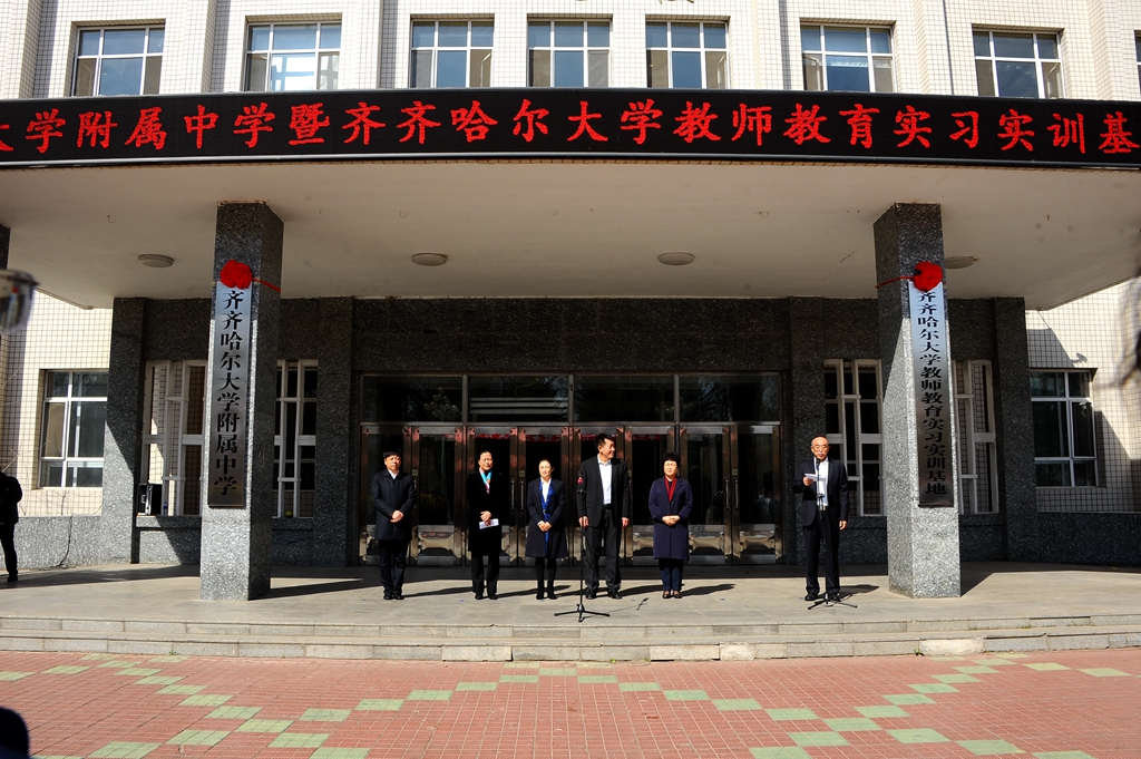 何晶、兰景力,刘艳芳、陈桂芝分别为齐齐哈尔大学附属中学和齐齐哈尔大学教师教育实习实训基地揭牌。