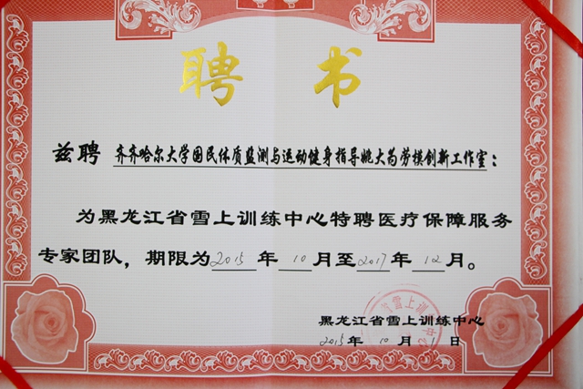 为备战2018年平昌冬季奥运会,“齐齐哈尔大学国民体质监测与运动健身指导姚大为劳模创新工作室”被黑龙江省雪上训练中心特聘为医疗保障服务专家团队,期限为2015年10月至2017年12月。