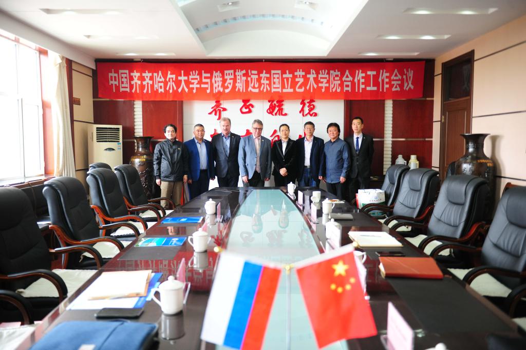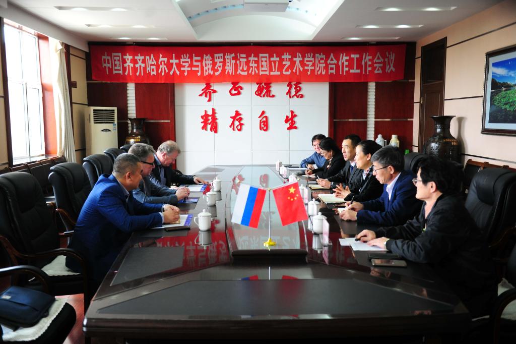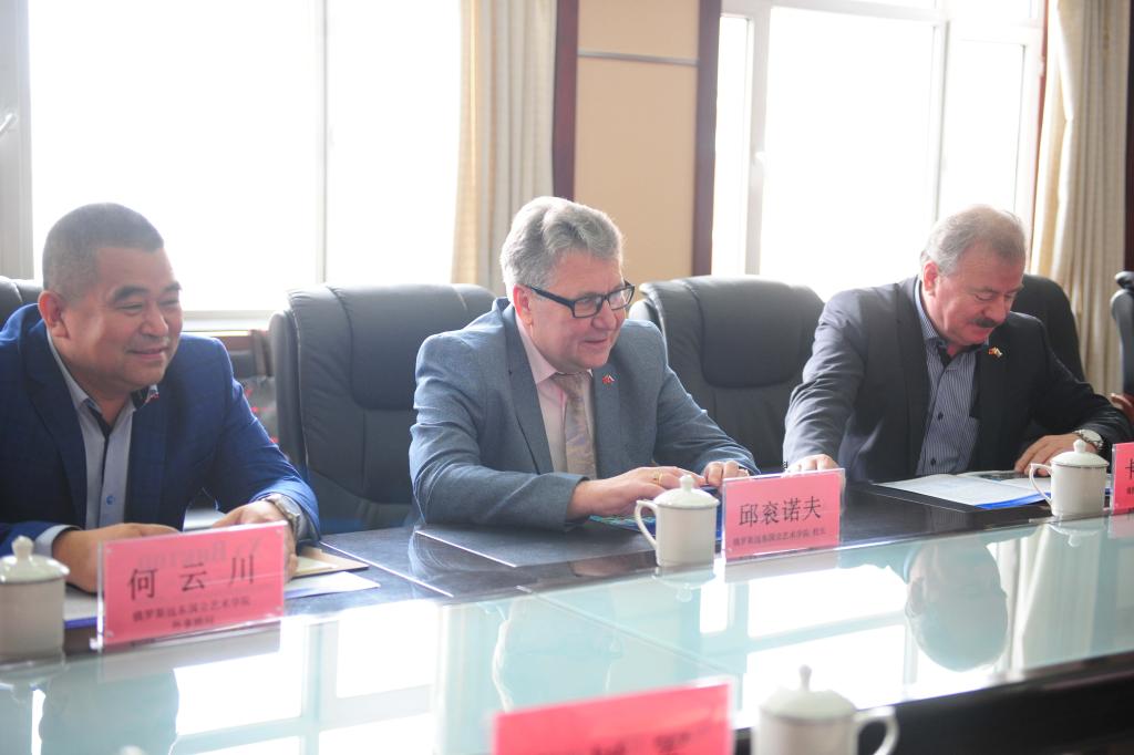 安德烈•酋谷诺夫院长对齐齐哈尔大学的热情接待表示感谢。他表示,这是第一次来到齐齐哈尔大学,非常荣幸受邀参加第十届中俄大学生文化艺术节。他从办学历史、学科设置、科研合作等方面介绍了俄罗斯远东国立艺术学院,并就本次艺术节期间的文化艺术交流活动和两校间可能展开的合作交流与齐齐哈尔大学领导交换了意见。
