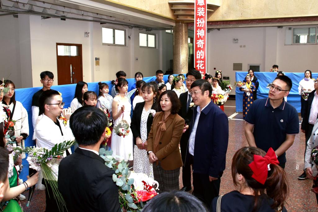 校党委副书记齐宏伟、张文治,副校长李英杰出席大赛开幕式,并在相关部门和学院领导的陪同下一起观看了展出作品,听取了参赛师生关于插花作品创意的说明。