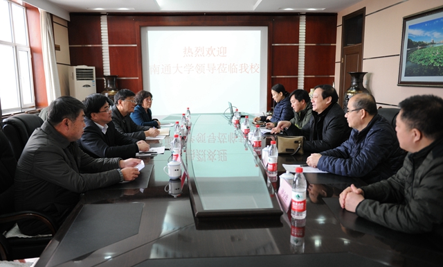 3月4日下午,南通大学副校长、研究生院院长董正超带领该校研究生工作部部长(研究生常务副院长、学科建设办公室主任)吴国庆一行来校专题调研研究生教育工作。我校党委常委、副校长邓启刚在504会议室亲切会见了董正超副校长一行。学校办公室主任张德庆、研究生部主任刘喜军、党委书记滕永富、副主任杨雷,科技处副处长伊全胜等参加了座谈、调研活动。