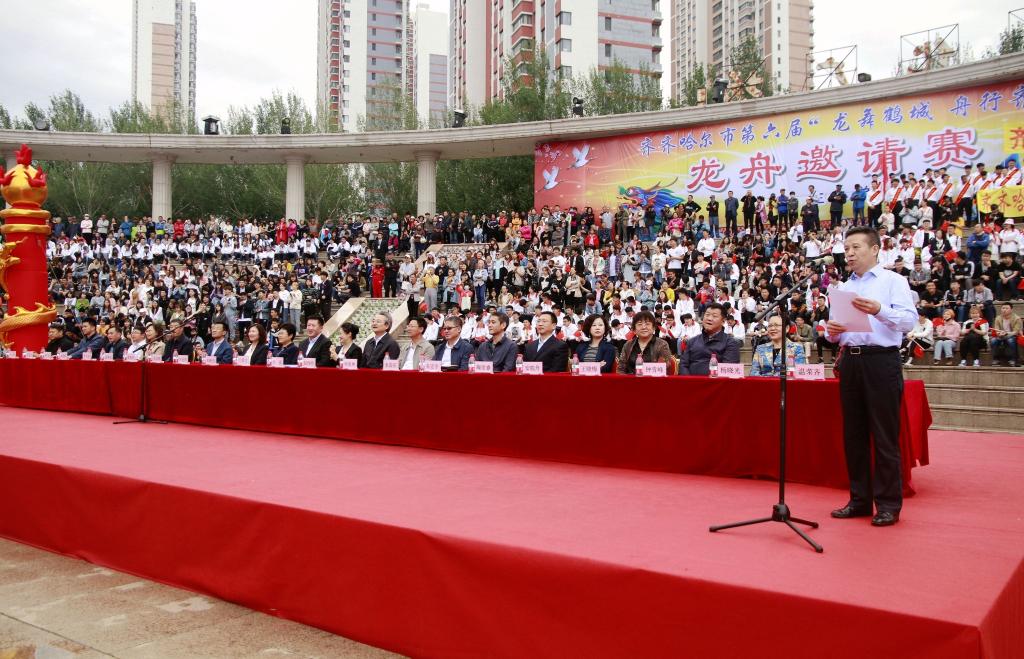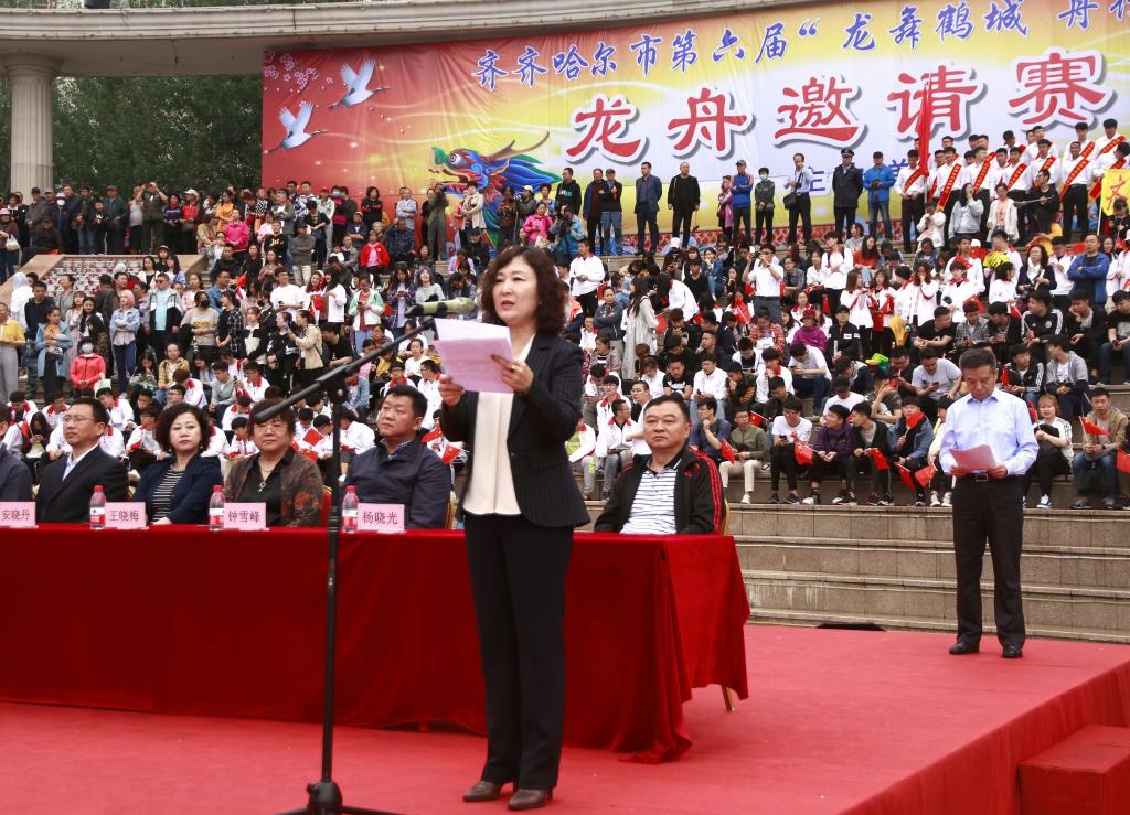 齐宏伟指出,赛龙舟是我国具有悠久历史、深受人民喜爱的民俗体育活动,体现了中华民族同舟共济、团结拼搏、奋勇争先的精神。为弘扬中华优秀传统文化,发挥大学文化传承创新作用,我校与齐齐哈尔市已经成功合作举办了五届“龙舞鹤城 舟行齐大”龙舟邀请赛。这项活动有力推动了文化强市建设,丰富了齐市人民的精神文化生活,现已成为魅力鹤城一道亮丽的城市文化风景线和校地合作共建的文化品牌。希望通过本届龙舟邀请赛的举办,能够进一步激发起鹤城人民和齐大师生“热爱祖国、建设家乡”的热情,为现代化新龙江新鹤城建设而不懈奋斗,以优异成绩迎接新中国成立70周年!最后,她预祝齐齐哈尔市第六届“龙舞鹤城 舟行齐大”龙舟邀请赛取得圆满成功!