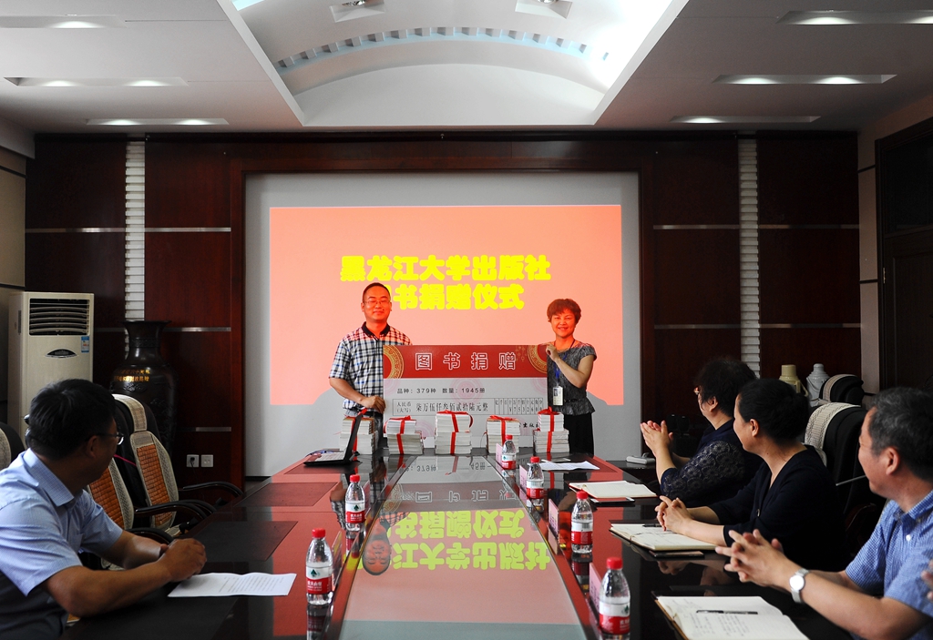 6月25日下午,黑龙江大学出版社图书捐赠仪式在学校办公楼504会议室举行,黑龙江大学出版社向我校捐赠价值7万余元的图书著作。黑龙江大学出版社社长张永超、副社长陈连生,我校校长陈桂芝、副校长吕厚均出席捐赠仪式,党委宣传部及图书馆相关工作人员参加了捐赠仪式。图书馆党委书记胥军主持仪式。