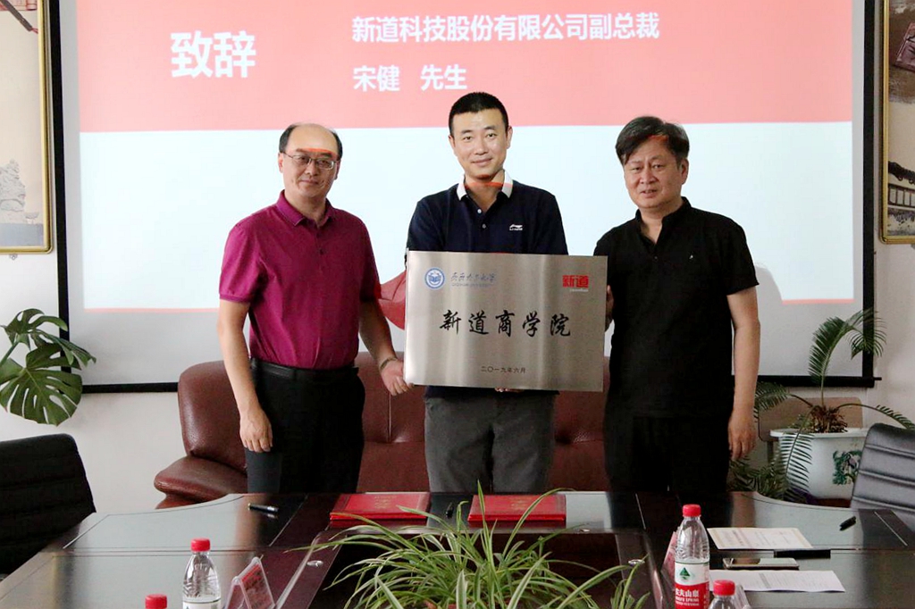 经济与管理学院院长王维与宋健签订了校企合作协同育人云财务与数字营销两个方向的协议,并共同为“新道商学院”揭牌。