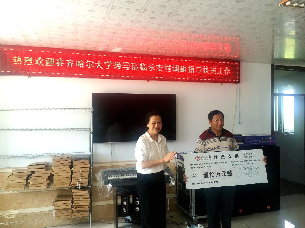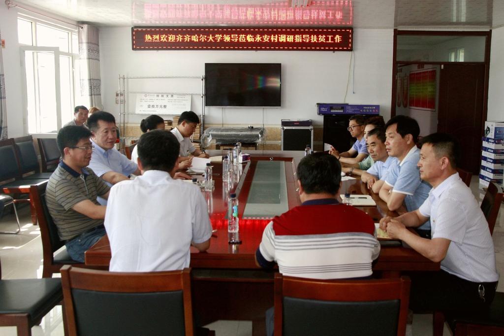 7月19日,校党委书记兰景力、校长陈桂芝带领学校相关部门领导,深入我校定点帮扶村拜泉县上升乡永安村调研指导扶贫帮扶工作,了解学校扶贫工作队驻村工作进展情况,走访慰问贫困村民,为帮扶村送上慰问金。拜泉县政协主席王民发、 县委常委统战部部长马占海、副县长李颖、县委组织部副部长杨和勇、乡党委书记吴凤波 、乡长马春城、驻村工作队成员及村干部陪同调研。