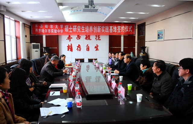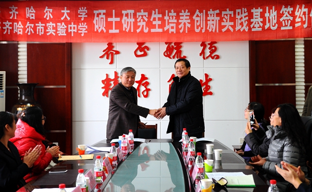 12月1日上午9时,我校与齐齐哈尔市实验中学在学校中区行政楼504会议室举行研究生培养创新实践基地签约揭牌仪式。我校党委常委、副校长邓启刚,齐齐哈尔市实验中学党委书记、校长孙景峰,实验中学副校长、高级教师邓波,实验中学副校长、高级教师崔宏翔,实验中学语文教研室主任、高级教师贲丽,实验中学英语教研室主任、高级教师翟大为,实验中学生物教研室主任、高级教师王岚,实验中学政治教研室主任、高级教师付兰萍,实验中学高级教师(生物)付本丽,实验中学高级教师(英语)陈秀丽等两校领导出席签约仪式。