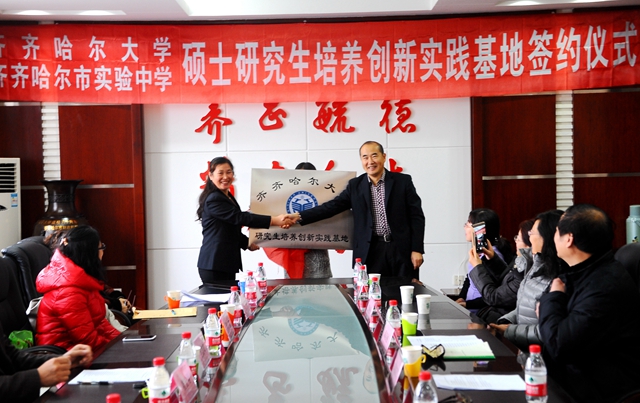 仪式上,校党委常委、副校长邓启刚与齐齐哈尔市实验中学党委书记、校长孙景峰代表两校签订了研究生培养创新实践基地共建协议。校研究生部主任刘喜军、齐齐哈尔市实验中学副校长邓波共同为基地揭牌。