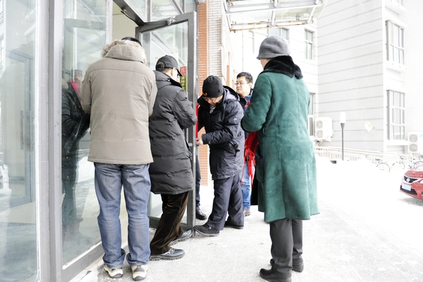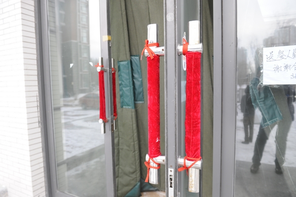 大雪初停,校园里一片银装素裹,心细的师生昨天下午会发现一个小变化,各教学楼、寝室楼的门把手“穿”上了红衣服,这样以后伸手开门的时候,就不会再直接接触冰冷的门把手了。