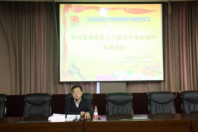 群团组织、学生社团等主动学习。连日来,群团系统、统战系统、工会系统等把全会精神学习纳入工作计划,举办了各种形式的学习、研讨活动,统一思想,凝聚共识。12月9日,齐齐哈尔市委讲师团副团长何莉教授应邀为我校团学骨干作了党的十八届五中全会精神辅导报告。负责思想政治教育工作的管理部门和教学单位还把全会精神作为学生形势政策教育和思想政治理论课的重要内容,以学生理论社团为依托,充分发挥党校、团校、特研会等各类宣传文化及学生社团的阵地作用,组织开展符合青年学生特点的学习宣传活动,推动全会精神进支部、进课堂、进教材、进学生头脑。