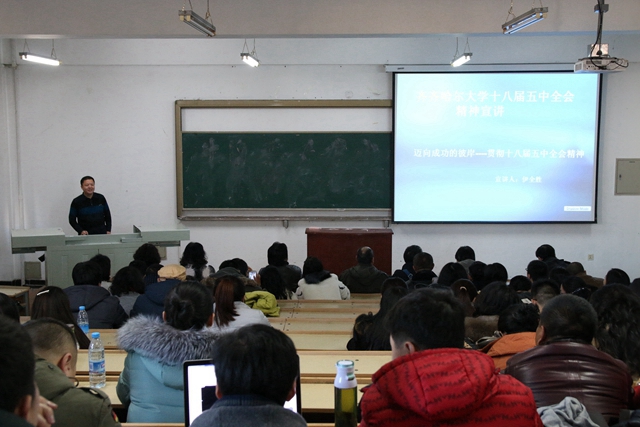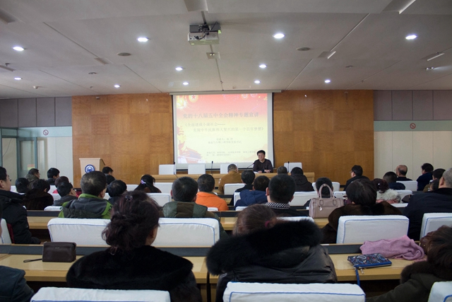 专题宣讲活动引导学习。在校党委宣传部和各基层党委(直属党支部)的共同努力下,学校组织理论专家,认真遴选专题,成立了由校党委副书记盖元臣教授亲自挂帅的“十八届五中全会精神宣讲团”。宣讲团于11月25日至12月9日,在全校范围内集中开展了面向全校各单位、各部门,覆盖全校师生,共计13场大型专题宣讲活动。其中,校党委副书记、教授、硕士生导师盖元臣主讲了《五大发展理念的历史逻辑与现实意义》;科技处处长、教授、博士、硕士生导师郑永杰主讲了《创新发展理念 推动科技创新》;食品与生物工程学院党委书记、副教授杨淳主讲了《全面建成小康社会——实现中华民族伟大复兴的第一个百年梦想》;科技处副处长、教授、博士、硕士生导师伊全胜主讲了《贯彻十八届五中全会精神 推动我校科技创新工作持续发展》;马克思主义学院副院长、教授、硕士生导师于春梅主讲了《在扩大对外开放中寻求合作共赢》;马克思主义学院中国近现代史基本问题教研部主任、副教授、博士、硕士生导师吴庆华主讲了《凝聚发展共识 实现科学发展》。