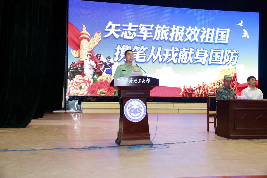 齐齐哈尔军分区建华区人武部政委钟拥军在会上宣读了《关于批准齐齐哈尔大学李洋洋等56名学生入伍的命令》。