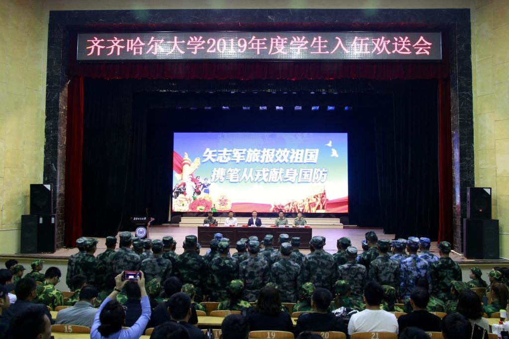 9月9日上午,学校在中区文化宫举行了2019年度新兵入伍欢送会,校党委常委、工会主席陶佰睿代表学校为56名应征入伍的齐大学子送行。齐齐哈尔军分区建华区人武部政委钟拥军及相关部门负责人出席欢送会,来自各学院的近千名大一新生参加了欢送会。大会由武装部(保卫处)部(处)长杜海权主持。