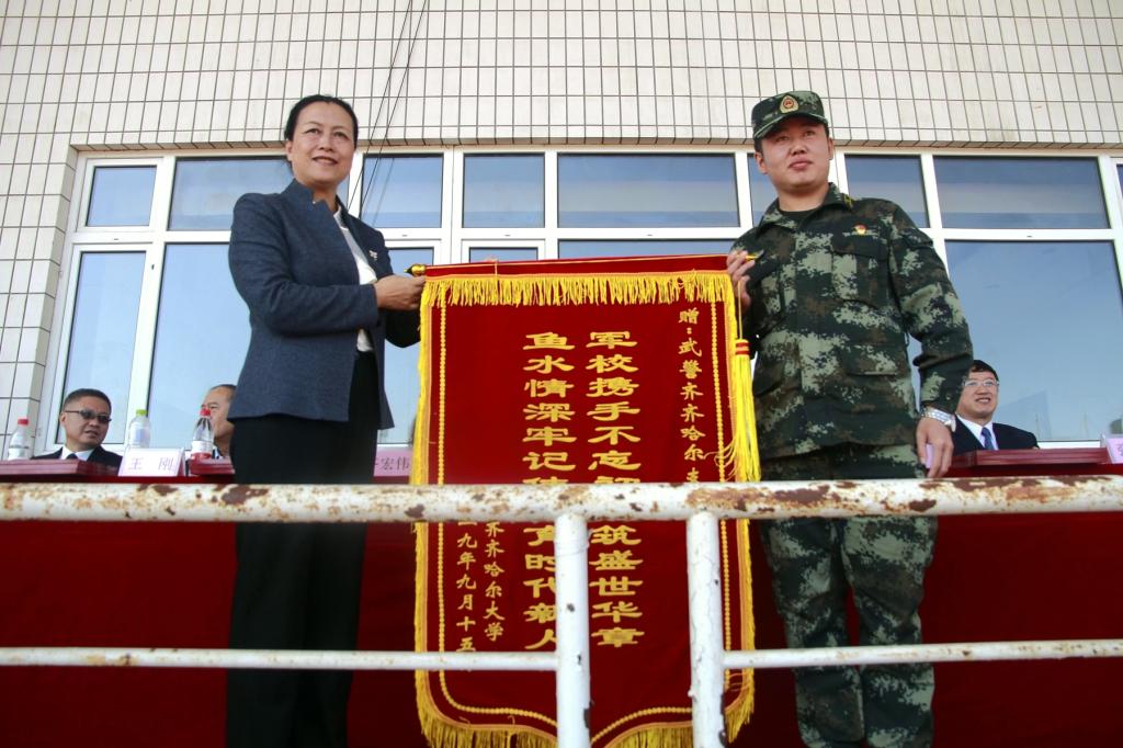 陈桂芝校长代表学校为承训部队——武警齐齐哈尔支队赠送锦旗,感谢部队全体军训教官的专业指导和艰辛付出,武警齐齐哈尔支队政治部副主任张金龙代表承训部队接受锦旗。