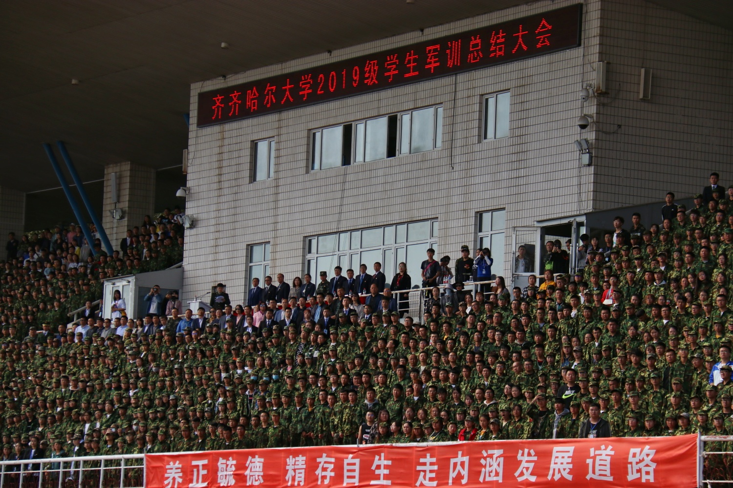 新生军训工作在各方面的共同努力下取得了圆满成功,为2019级大一新生上好了开学的第一课。在举国上下喜迎新中国成立70周年之际,齐齐哈尔大学全体党员领导干部将以“不忘初心、牢记使命”主题教育为契机,深入学习贯彻习近平新时代中国特色社会主义思想,落实“守初心、担使命,找差距、抓落实”总要求,不忘立德树人初心,牢记教书育人使命,努力培养能够担当民族复兴大任的时代新人,以更加优异的成绩为新中国70华诞献礼。