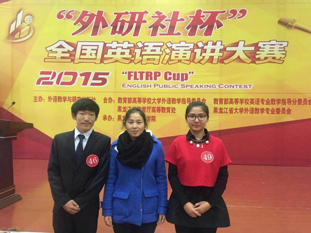 “外研社杯”全国英语演讲大赛是全国规模最大、最具权威性的英语演讲赛事,本届“外研社杯”全国英语演讲大赛由教育部高等学校大学外语教学指导委员会和外研社共同主办,黑龙江省大学外语教学专业委员会和黑龙江省教育厅共同协办。公共外语教研部对此项赛事高度重视,积极开展各方面工作,举行了海选、初赛、复赛等一系列赛事,200多名选手经过层层选拔,最后选派2位学生代表齐齐哈尔大学参赛,公共外语教研部专门指派教师对参赛选手进行培训,进行赛前指导,对演讲题目、演讲内容、问题设置、资料准备、演讲技巧、仪表仪态、语音语调、心理调适等方面进行了充分准备,带队老师赛场实时指导,经过多方共同努力,终于实现了成绩的历史突破,取得了傲人的成果。