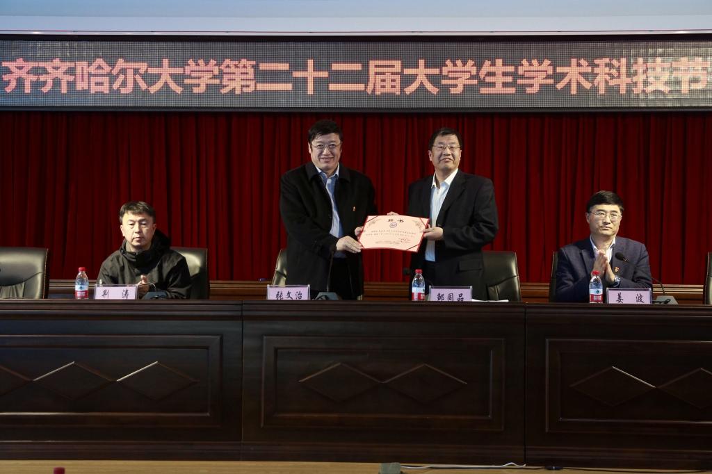 开幕式举行了创新创业导师聘书颁发仪式,张文治为我校曾获得第三届“挑战杯”全国大学生课外学术科技作品竞赛一等奖的优秀校友、制糖工程专业93届毕业生邹同品,颁发了齐齐哈尔大学创新创业导师聘书。