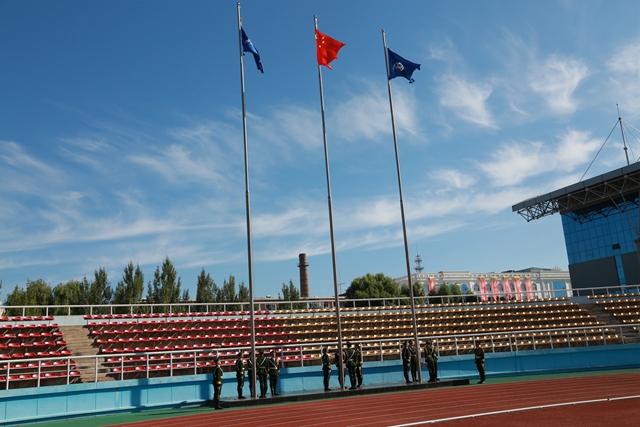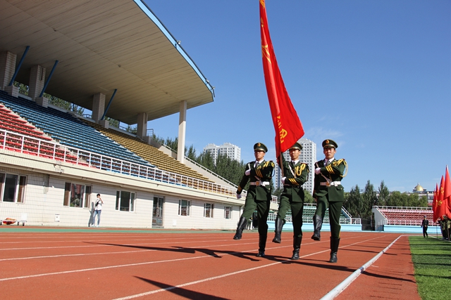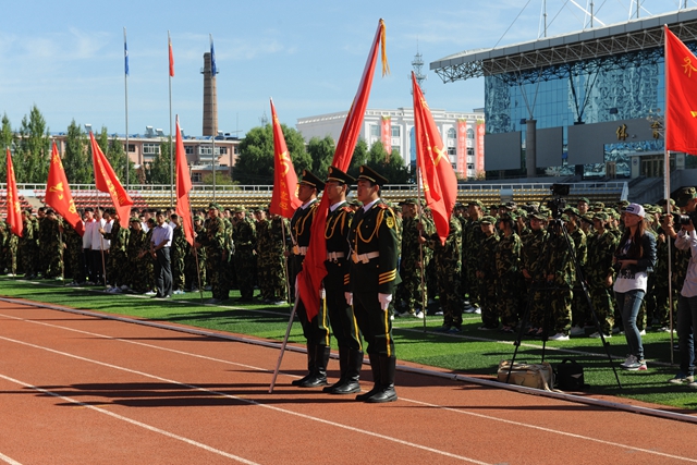 学生代表迎“齐齐哈尔大学军训团团旗”