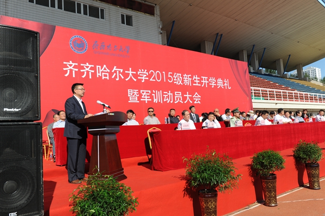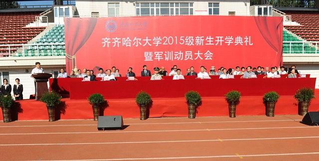 校党委书记李海红,校长马立群同志,校党委副书记盖元臣,常务副校长郑喜群,副校长邓启刚、王刚、李英杰,党委常委、组织部部长齐宏伟,承训部队首长、武警齐齐哈尔支队副参谋长矫占峰中校,特邀嘉宾,我校优秀校友代表、工业分析专业八八届毕业生、大庆油田勘探开发研究院总工程师、北京奥运会火炬手、全国“五一”劳动奖章获得者、全国劳动模范伍晓林等出席典礼并在主席台前排就坐。各学院院长、党委书记、军训团组成单位领导,来自全国各地的2015级新同学(本科生、研究生)参加了开学典礼。
