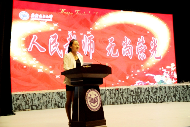 学生代表、校学生会主席、经济与管理学院工商管理专业12级6班刘烨玮同学在大会上发言。她说,在这个温馨、喜悦的日子里,请允许我代表广大学子为老师们送上最真挚的祝福:老师,祝您节日快乐!美丽齐大的老师,是我们这些来自祖国各地、四面八方的莘莘学子成长、成才、成就出彩人生的引路人和支持者。作为学生,我为能够在人生之初选择这样一所好大学、遇到这样一批好老师而满满感动和深深自豪。教育是爱的事业,我们的老师用言传身教演绎着爱的奉献。正因为有了老师们的关爱与指引,才有了我们的成长与成才。作为齐大的学子,我们是幸运的,更是幸福的。我们将勇敢肩负起传承齐大精神的重任,怀揣着对老师们的感恩,学以致用、明德致远,用脚踏实地的行动同敬爱的老师们一起续写齐大的辉煌,创造更加美好的明天!我代表全体同学,向最美丽的齐大老师们,致以最衷心的感谢、最崇高的敬意和最真诚的祝福,祝老师们节日快乐,身体健康,工作顺利,万事如意!