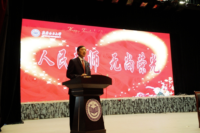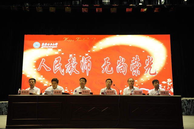 校党委书记李海红在庆祝大会上讲话。他说,首先,请允许我代表学校党政领导班子向在座的各位老师,并通过你们向全体教职员工以及离退休的老教师、老领导、老同志们表示节日的问候并致以崇高的敬意!