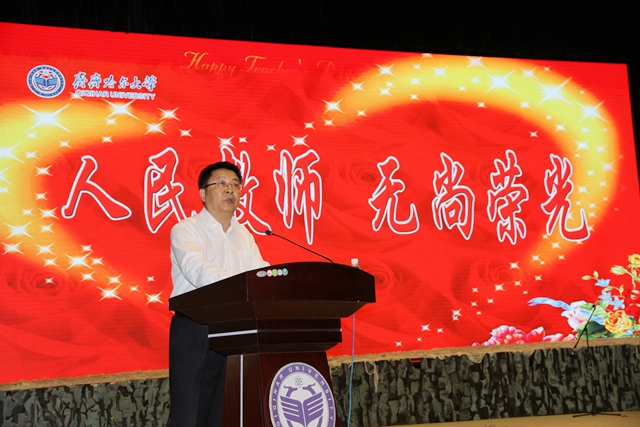 他指出,教师以教书育人、培养人才为己任。在纪念和庆祝第31个教师节的时候,就让我们从我们培养教育的对象,我们的学生开始谈起。他枚举了几个具有典型意义的同学。如今年年初春节期间走进央视黄金时段“回家过年”栏目的教育与传媒学院李鑫同学,音乐与舞蹈学院以一曲藏语版的《喜欢你》走红微信和网络的普达杰同学,哲学与法学学院考研成功的肖雅和房圆圆同学以及理学院地理系考研同学群体,连续4年夺得全国第九届大学生化工设计竞赛一等奖的化学与化学工程学院同学群体,作为哈外高校唯一一名学生代表、即将在全省庆祝教师节文艺晚会上登台献歌的音乐与舞蹈学院李传龙同学等,并以近年来毕业生离校时发生的巨大变化为例,集中阐明:“我们的同学为什么这么优秀?为什么能不断带给我们惊喜?这背后的奥秘是什么?”他指出:“优秀的学生背后,一定站着一批优秀的老师!是我们全体教职员工辛勤付出,用我们的大爱去感染同学,以我们的大道去引领同学,用我们的大学去启迪同学,为人做到了身正,为师做到了上善,为学开启了智慧!”