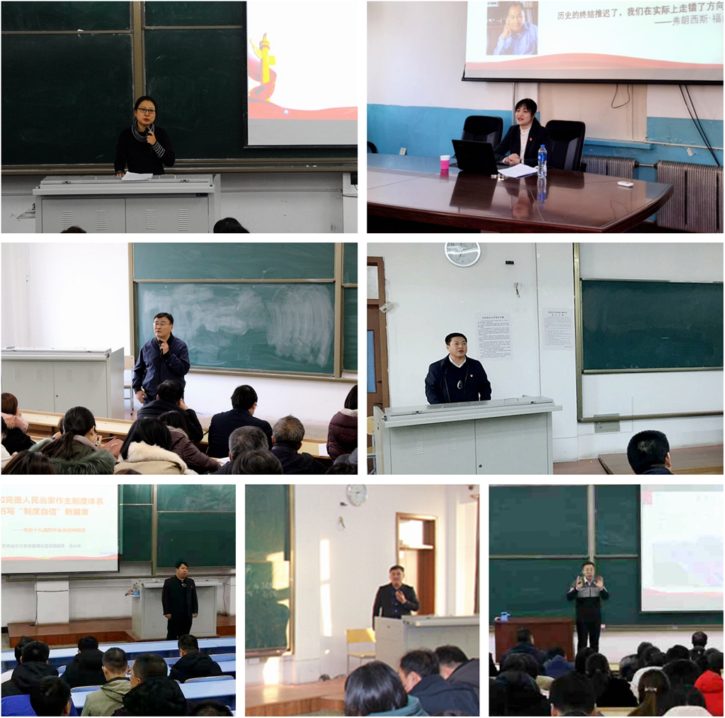 今年10月,学校被省委宣传部命名为“全省基层思想政治工作示范点”。我校充分发挥理论优势、专家优势,积极辐射带动地方党员群众学习宣传党的十九届四中全会精神。市委宣讲团成员、哲学与法学学院党委书记于春梅教授参加了省委宣传部主办的全省学习宣传贯彻党的十九届四中全会精神理论宣讲骨干培训班的培训,受市委宣传部指派,深入到齐齐哈尔市文联系统和讷河市宣讲党的十九届四中全会精神,并在会后与参会党员干部进行了面对面地互动交流,就学习过程中存在的疑惑进行了详细的解答。学校办公室副主任徐凤江副教授通过集中培训考核,被团省委、省委宣传部、省委教育工委、省社科联聘为黑龙江省“青年讲师团”宣讲专家。我校驻拜泉县上升乡永安村第一书记、扶贫工作队队长秦浩波在永安村为村里党员群众宣讲党的十九届四中全会精神,接地气的宣讲受到了群众的欢迎。