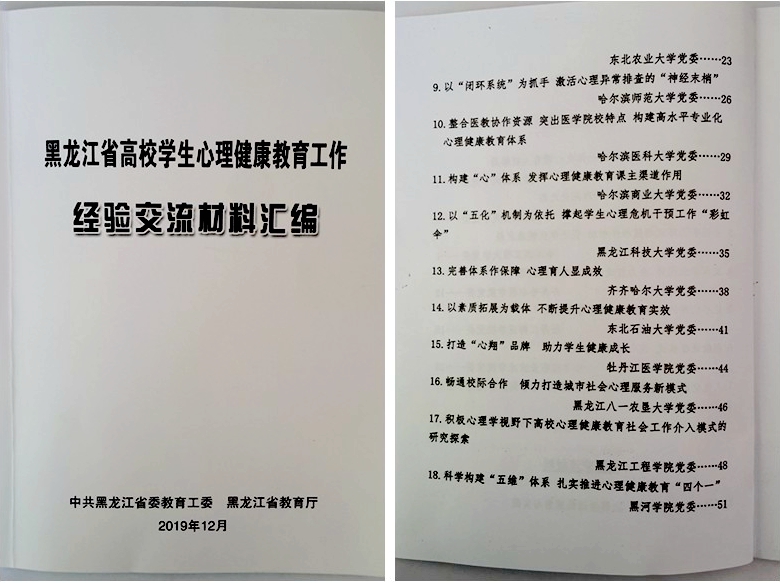 会上,黑龙江大学、哈尔滨工业大学、哈尔滨工程大学、齐齐哈尔医学院、牡丹江师范学院、哈尔滨职业技术学院、黑龙江生态工程职业技术学院7所高校党委做了高校心理健康教育工作经验交流发言,我校心理健康教育工作总结被收录全省心理健康教育工作经验交流材料汇编进行书面交流。