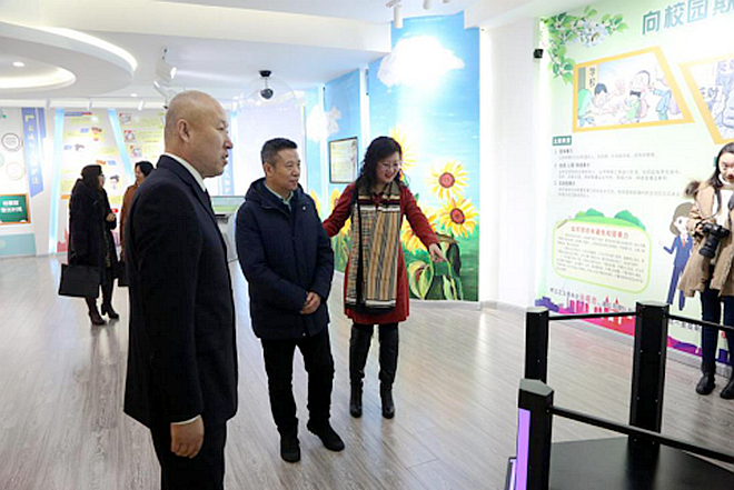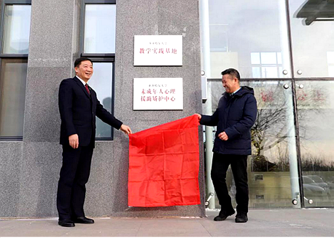 李英杰与李雪峰共同为“齐齐哈尔大学教学实践基地”和“齐齐哈尔大学未成年人心理援助矫护中心”揭牌,并和参会人员共同参观富裕县检察院未成年人检察工作区。