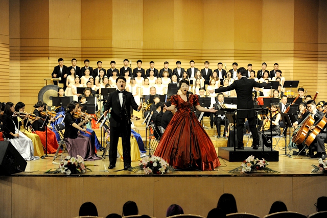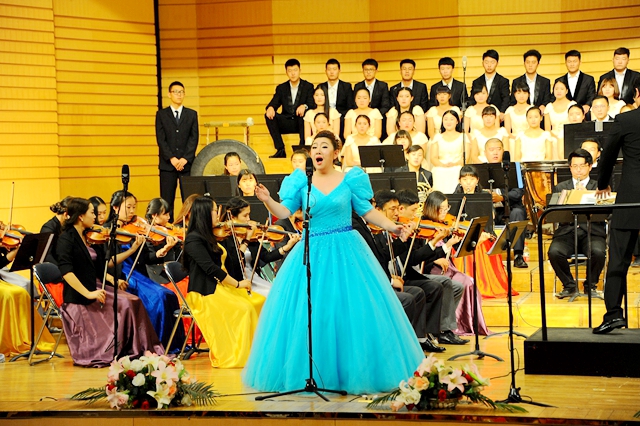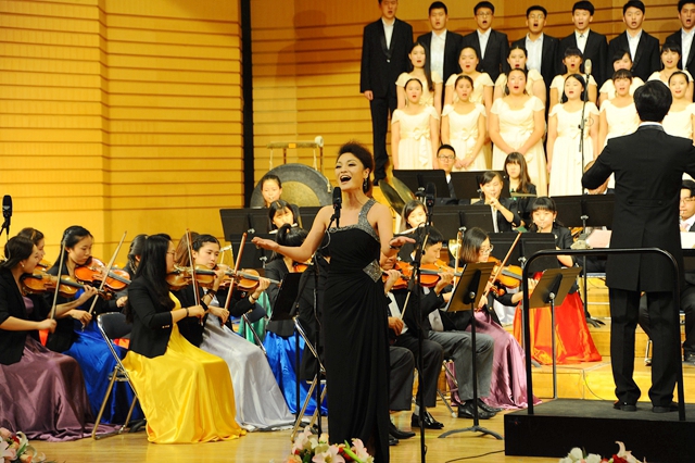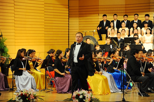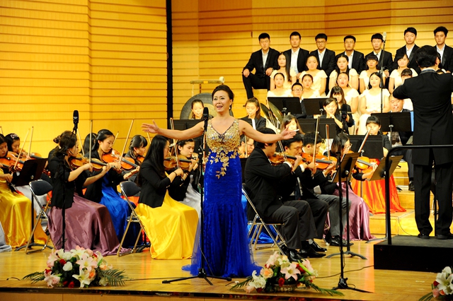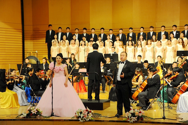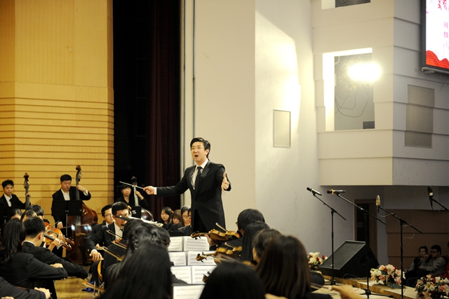 在播放视频片和纪念抗战胜利征文颁奖仪式后,“齐齐哈尔大学纪念中国人民抗日战争暨世界反法西斯战争胜利70周年文艺晚会”在交响乐团陈曦泽指挥的交响序曲《红旗颂》中拉开帷幕。