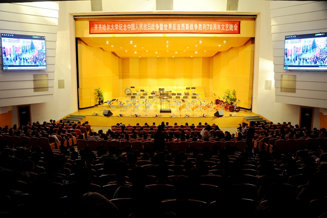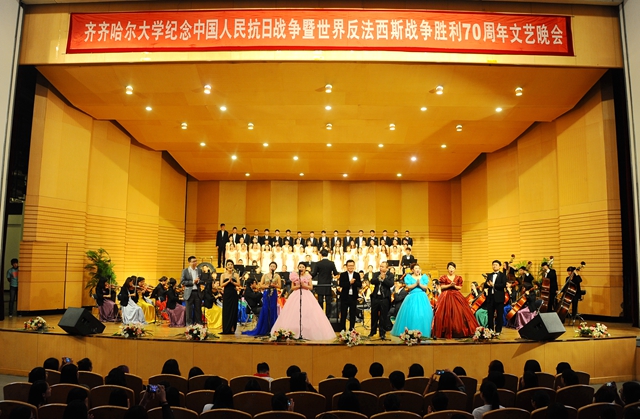 在全体演职人员合唱《走向复兴》歌声中,齐齐哈尔大学纪念中国人民抗日战争暨世界反法西斯战争胜利70周年文艺晚会圆满结束。