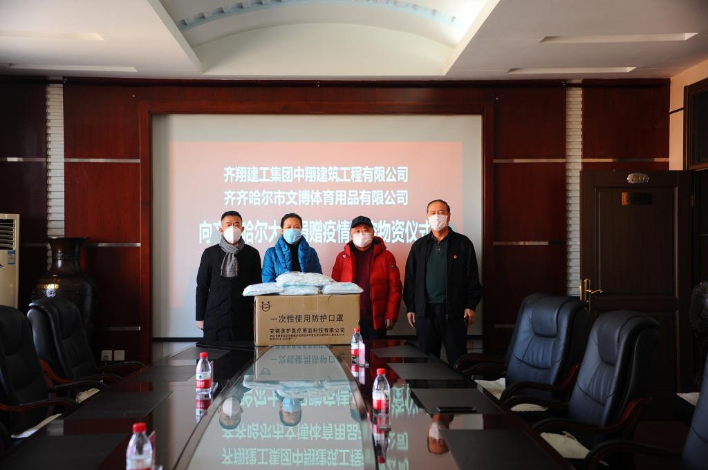 3月16日上午,齐翔建工集团中翔建筑有限公司经理姚滨、齐齐哈尔市文博体育用品有限公司董事长罗文章一行专程来校,向我校捐赠医用口罩一万只,专项用于学校应对新冠肺炎疫情的防控工作。学校在办公楼504会议室举行了捐赠仪式,校党委书记、校长陈桂芝,党委常委、副校长王刚出席仪式,后勤管理处党委书记、处长李军与两位爱心企业代表参加了捐赠仪式,仪式由陈桂芝主持。