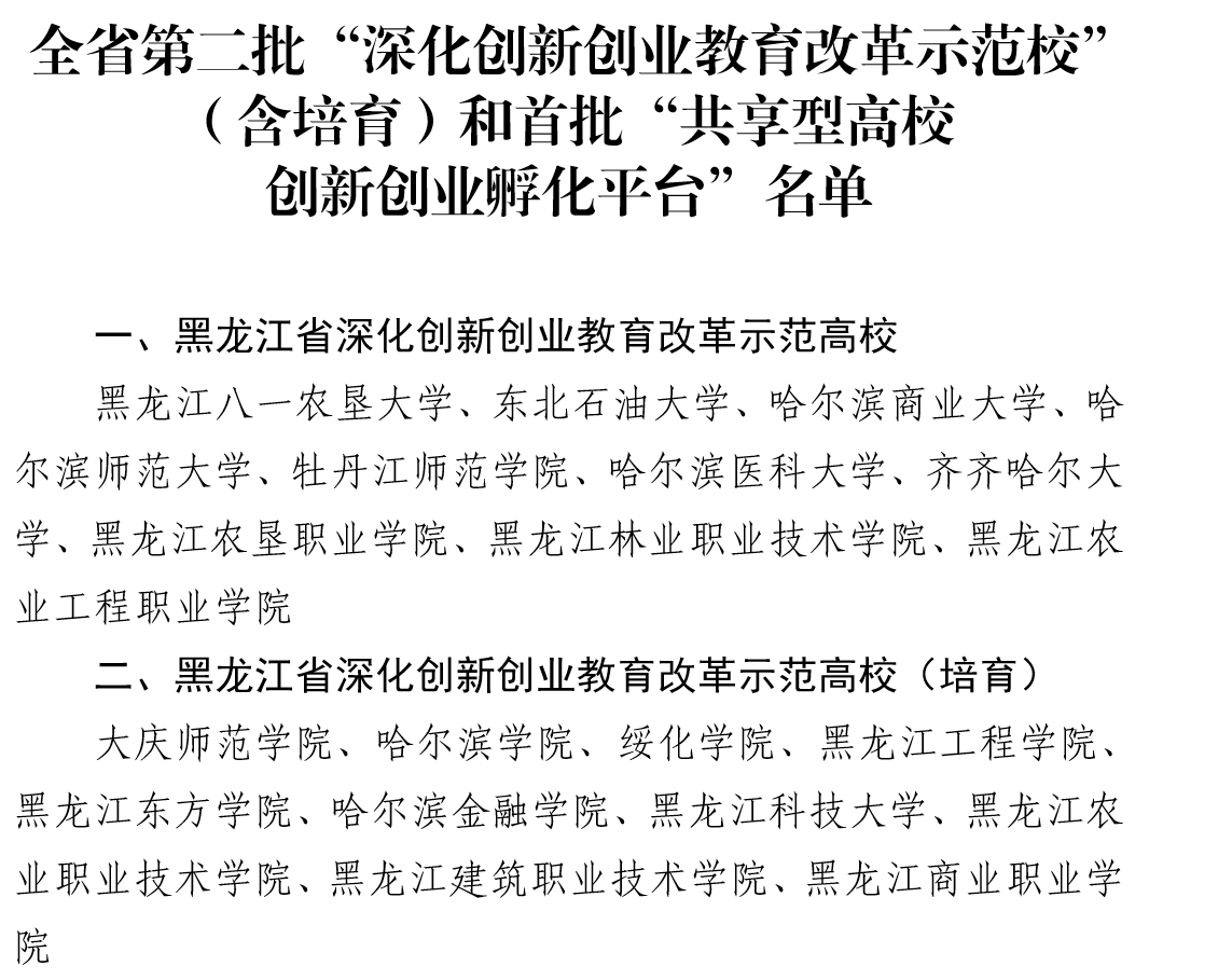 2019年,为加强大学生创新创业能力培养,推动创新创业教育融入人才培养体系全过程,打造符合时代特征、区域特点和高校特色的龙江创新创业教育 2.0 版,省教育厅部署了《关于开展 2019年度全省普通高等学校创新创业教育工作调研的通知》(黑教高办函 〔2019〕132 号)相关工作,我校积极申报了全省第二批“深化创新创业教育改革示范校”。